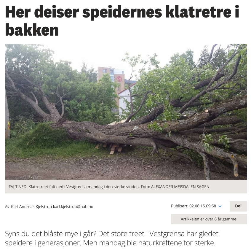 1. juni 2015 derimot tok naturkreftene tak i treet, og det blåste over ende. Treet har vært en fin del av gruppa, symbolisert skogen i et ellers ganske urbant område – Alexander Meisdalen Sagen, til Nordre Aker Budstikke. Vi har ikke et like majestetisk klatretre nå om dagen, men ser du nøye etter utenfor hytta er det ganske tydelig hvor speidere i alle aldre sklir opp og ned gjørmen i skråningen for å nå ned til dagens klatretre.